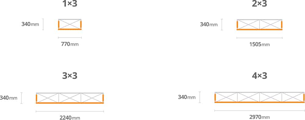 - 4 dimensions each with a 340mm depth and 2235mm height